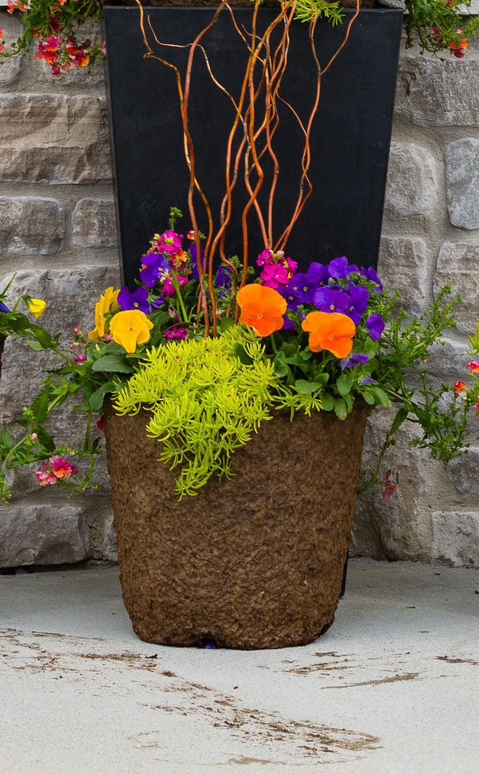 Sunny Days is a bold yet balanced mix of luminous yellow, crisp green, dramatic purple, and touches of rich dark pink blooms, accented with curly willow branches—designed to brighten outdoor...